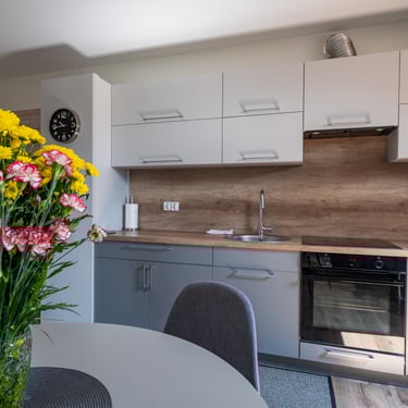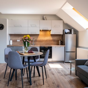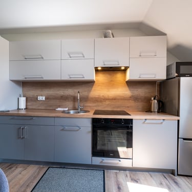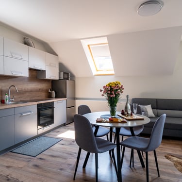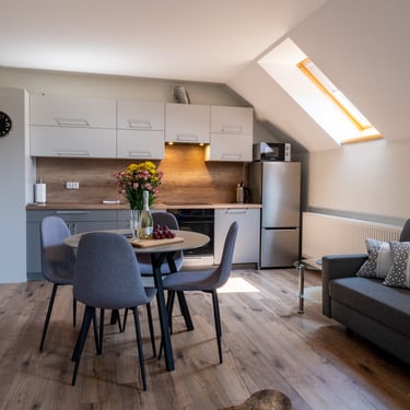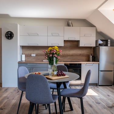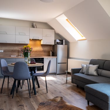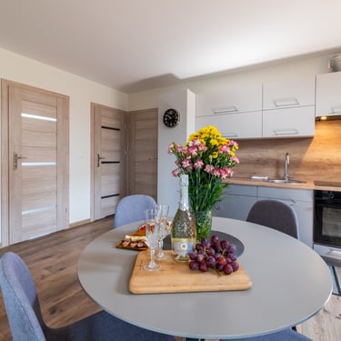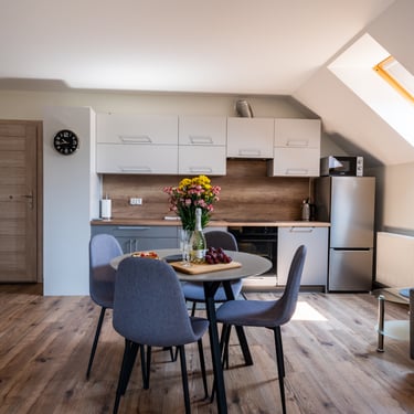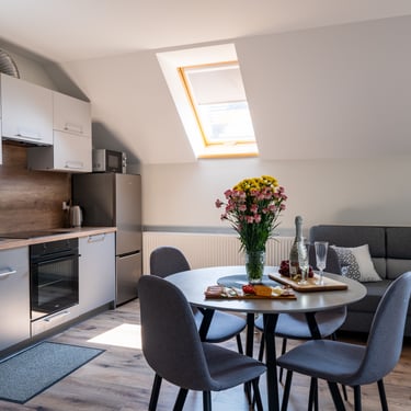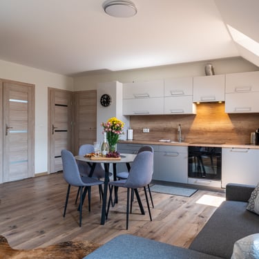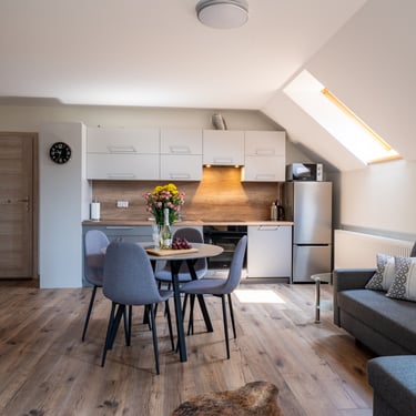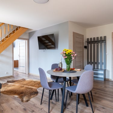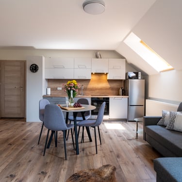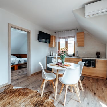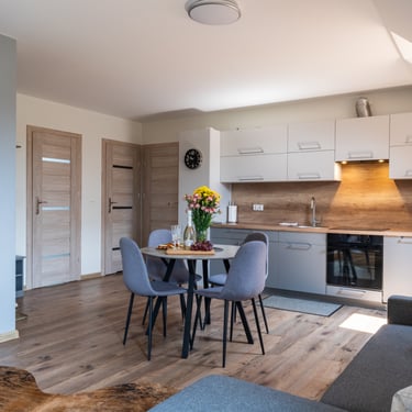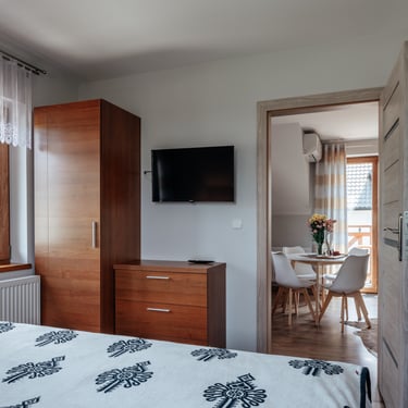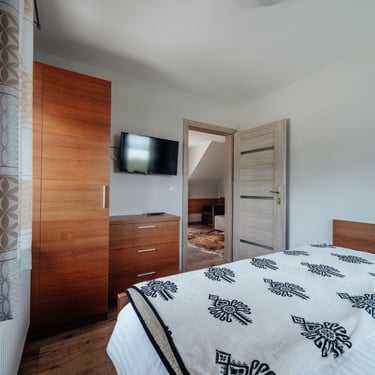 Nasz Apartament 5-osobowy o powierzchni 38 m² to idealne miejsce dla mniejszych grup, rodzin lub par, które szukają komfortowego wypoczynku w przytulnym otoczeniu. Apartament składa się z jednej sypialni oraz przestronnej strefy dziennej z rozkładaną sofą, która pomieści dwie osoby, oraz rozkładanym fotelem, który zapewnia komfort jednej osobie. Dodatkowym atutem jest balkon, na którym można odpocząć i cieszyć się świeżym powietrzem. Choć apartament nie jest wyposażony w piekarnik czy ekspres do kawy, jego funkcjonalność sprawia, że jest doskonałym wyborem na krótki lub dłuższy pobyt.