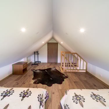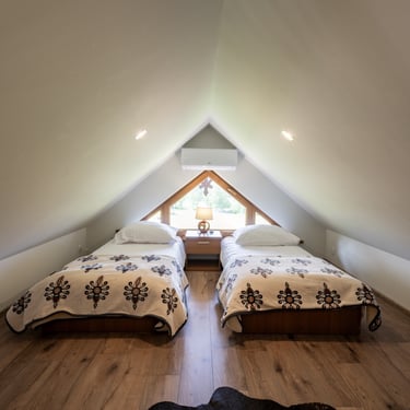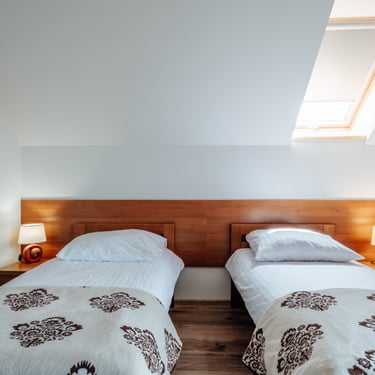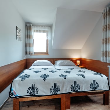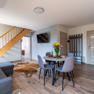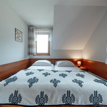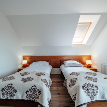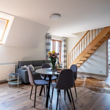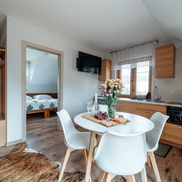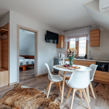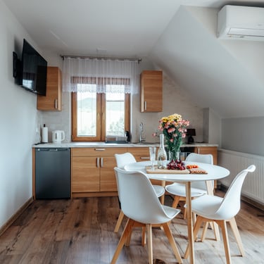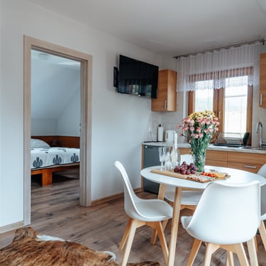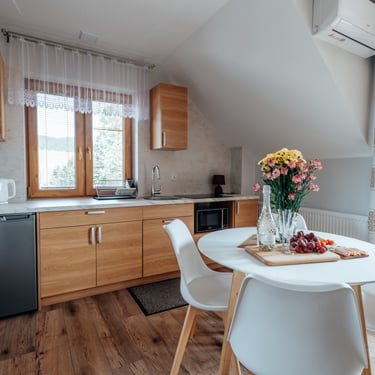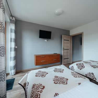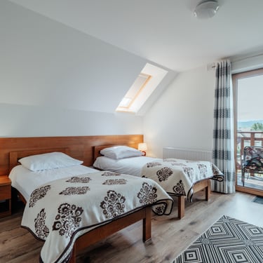 Nasz Apartament Deluxe o powierzchni 60 m² to przestronne i komfortowe wnętrze, idealne dla rodzin, grup przyjaciół lub par, które pragną spędzić niezapomniany czas w malowniczej okolicy. Apartament wyposażony jest w 4 pojedyncze łóżka oraz rozkładaną dwuosobową sofę, co zapewnia wygodę i przestronność dla sześciu osób. Z jego okien oraz balkonu roztacza się zapierający dech w piersiach widok na Jezioro Czorsztyńskie oraz otaczające góry, co sprawia, że pobyt staje się prawdziwą przyjemnością. Na balkonie znajdują się stolik i krzesła, idealne do relaksu na świeżym powietrzu.